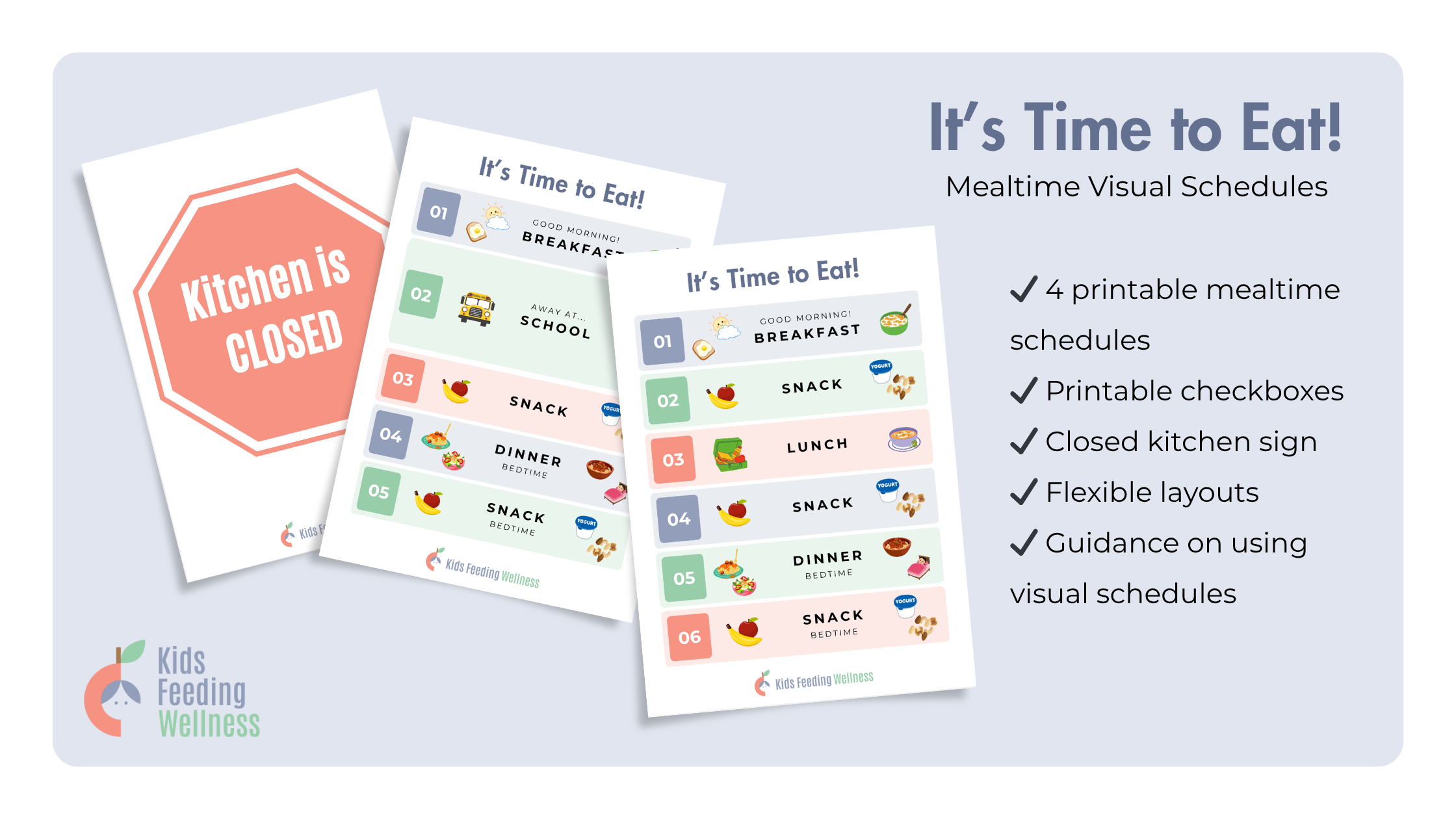 Visual tools help kids see when meals are coming. Our It’s Time to Eat! guide includes 4 printable mealtime schedules you can print and laminate so you and your child can track meals together.